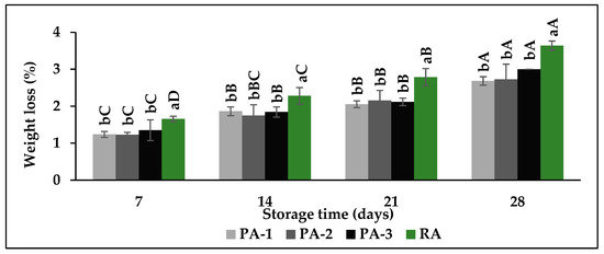 Weight loss gradually increased with storage time in all atmospheric compositions. Minimum weight loss was determined in PA-1 (2.68%) followed by PA-2 (2.73%), PA-3 (3.00%), and RA (3.64%) after 28 days of cold storage (Figure 2).