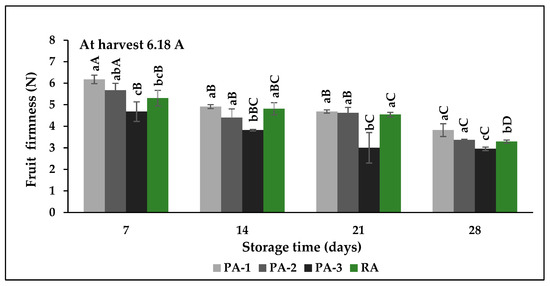 Effects of different atmospheric compositions on fruit firmness in fresh fig cv. Bursa Siyahi. Different uppercase letters indicate significant differences for each atmosphere composition during storage and different lowercase letters indicate significant differences between atmosphere compositions for each sampling date at p ≤ 0.05 by Duncan’s multiple range test. Data are the mean ± SE of three replicates. PA-1: 3% O2 + 10% CO2; PA-2: 3% O2 + 15% CO2; PA-3: 3% O2 + 20% CO2; RA: 21% O2 + 0.03% CO2.