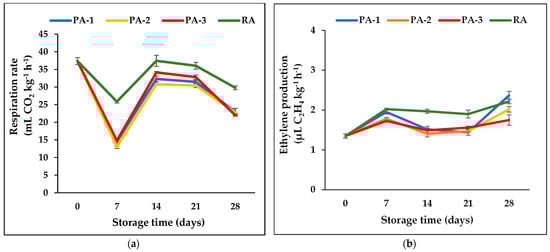The respiration rate of fresh fig at harvest was 37.38 mL CO2 kg−1 h−1 and sharply decreased in all storage atmospheres after 7 days of storage (Figure 4a). This situation can be the result of low temperature effects on the respiration rate. Allegro et al. [34] reported that the initial respiration rate of Dottato figs was 28.0 ± 2.5 mL CO2 kg−1 h−1 and decreased to 6.8 ± 1.8 mL CO2 kg−1 h−1 in the fruit stored at 4 °C after 72 h. A similar decreasing trend after storage was also reported in fig fruit belonging to the cultivars Cuello Dama Blanco, Cuello Dama Negro, and San Antonio [21]. In this study, at the 14th and 21st days of storage, the highest respiration rate was found in the fruit stored in RA, while the lowest rates were found those stored in PA-1 and PA-2. At the end of the storage period, fig fruit stored under different atmospheric compositions had lower respiration rates compared to the fruit stored in RA; however, there were no significant differences among the PA-1, PA-2, and PA-3.