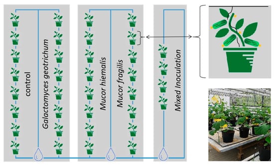 C. sativus plants (F1 hybrids) of the cultivar ‘Platina’ (Nunhems Germany GmbH, Marbach, Germany) were grown in 10 L soil pots (Substrat 1, Klasmann-Deilmann GmbH, Geeste, Germany) under greenhouse conditions. Universal fertilizer WUXAL® (Wilhelm Haug GmbH & Co. KG, Düsseldorf, Germany) was applied weekly starting with the 6th week after sowing (100 mL of 1:1000 Fertilizer–water solution). Plant irrigation was performed by drip irrigation and was adjusted to the plant growth and climate. Blossoms of eight cucumber plants were inoculated with one of the three fungi M. hiemalis, M. fragilis, or G. geotrichum by spraying the spore suspension (see Section 2.3.2). Blossoms of four plants were inoculated with a mixed spore solution of all three fungi. Eight additional untreated plants served as controls. Plants with the same treatment were grown side by side and spaced apart from plants with different treatments and control. The experimental design is shown in Figure 1. Phenotypic characteristics of all plants were visually assessed each week to record the size (up to week 5 after sowing), yield, and presence of disease symptoms on leaves, flowers, and fruits.