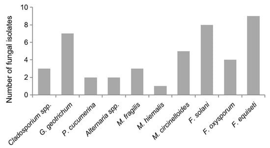 The six different genera Fusarium, Mucor, Galactomyces, Plectophaerella, Alternaria, and Cladosporium were identified from 44 separated fungal colonies using the ITS sequence data and supported by morphological determinations. Fusarium occurred most frequently with nearly 48% of all isolates, followed by Mucor with 20.5%. The following species were identified: F. equiseti, F. oxysporum, F. solani, M. hiemalis, M. fragilis, M. circinelloides, G. geotrichum, and P. cucumerina, while isolates identified as Alternaria sp. and Cladosporium sp. could not be determined more specifically. Figure 2 shows the frequency of fungal isolates from the total number of fungal cultures analyzed.