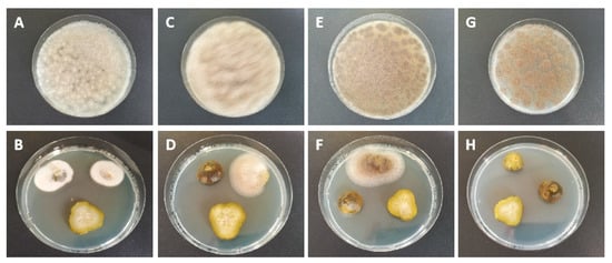 Fungal growth on samples taken from inoculated ready-to-sell pickle jars. Ready-to-sell pickle jars were inoculated with different fungi isolated from rotten gherkins to simulate fungal contamination and potentially induce softening of the pickles. Fungal growth was evident on the gherkin slices and vinegar broth placed on a nutrient medium after 14 days after inoculation in Galactomyces geotrichum (A,B), Mucor fragilis (C,D), and Mucor hiemalis (E,F). The latter grew even after 28 days after inoculation in the applied vinegar broth (G,H). The aim was to analyze the fungal tolerance to the acidic-salty milieu in the pickle jar.