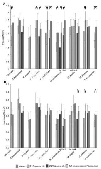 Texture changes in gherkins due to fungal inoculation. Ready-to-sell pickle jars were inoculated with spore suspensions of the fungi Plectosphaerella cucumerina, Mucor hiemalis, Mucor fragilis, Mucor circinelloides, Galactomyces geotrichum, Fusarium oxysporum, Fusurium equiseti, Cladosporium sp., and Alternaria sp. Inoculation was performed with the final concentrations of 2000 spores/mL (dark gray) and 200 spores/mL (vertically striped) in the jar or with a fungus-covered 1 cm × 1 cm PDA section (checkered) if no spores could be obtained. Afterward, the jars were re-pasteurized, and after six months of storage, the crunchiness (N/mm2) (B) and firmness (N/mm) (A) of the gherkins were measured. Texture values of individual samples were compared with controls (medium gray) from the same batch (lot 1 and lot 2 are different batches with the same inoculant). ANOVA was performed with significant correlations at * p ≤ 0.05, ** p ≤ 0.01, *** p ≤ 0.0001. Shown are the mean values (n = 6 to 28) with standard deviation.