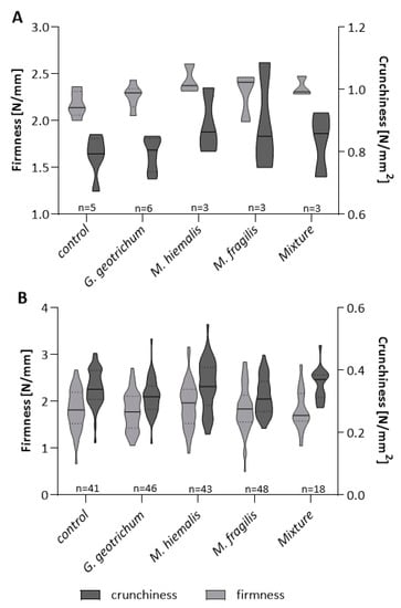 The texture was measured from a total of 216 harvested greenhouse gherkins. The blossoms of the plants were previously treated with G. geotrichum, M. hiemalis, M. fragilis, or a mixture of all three fungi. Control gherkins were harvested from untreated plants. Neither the plants nor the fruits showed any phenotypic symptoms indicating a fungal infection, a decline in plant health, or a change in the quality of the gherkins due to the fungal inoculation during the entire trial period. Furthermore, 196 gherkins were pasteurized after harvest and stored for 12 weeks before texture measurements.