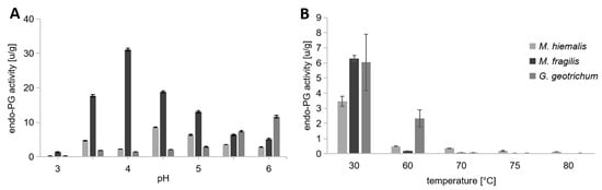 In addition, further trials with varying temperatures between 30 °C and 80 °C and fixed pH at 5.5 were performed to investigate the heat tolerance of the enzyme. The aim was to verify whether pasteurization can inactivate endo-PG induced by various fungi. The mean values of the temperature trials are shown in Figure 7B. Each measurement of enzyme activity was performed twice with the same extract obtained from the inoculated cucumber bouillon under identical conditions. The measurement at 30 °C required the preparation of two extracts obtained from one bouillon with the same inoculant. Due to this, larger standard deviations were measured. The enzymes are almost completely inactivated in all fungal inoculation variants at the maximum temperature of 80 °C and a heating period of three minutes. The high endo-PG activity measured at 30 °C was not detected in any of the samples above 60 °C and was highest in bouillon samples inoculated with G. geotrichum at 2.33 u/g, followed by M. hiemalis (0.5 u/g) and M. fragilis (0.18 u/g) inoculated bouillons. The enzyme activity decreased further with increasing temperature and was finally close to the detection limit in all measurements. The pasteurization of pickles occurs at a minimum of 80 °C (>3 min). Therefore, the endo-PG of the fungal inoculants used here would be expected to be inactivated during this process.