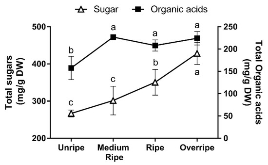 Total sugars and total organic acids (mg/g dry weight) (DW) during the development stages of H. edulis fruit: unripe, medium ripe, ripe, and overripe. Values represent means ± S.E. Different letters indicate significant differences according to the Tukey test (p ≤ 0.05).