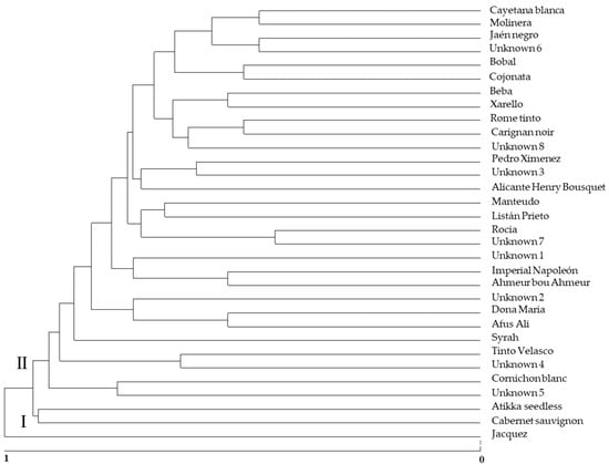 SSR analysis allowed for the evaluation of the genetic relationships among European cultivars and unknown accessions recollected in different regions of Andalusia. The dendrogram in Figure 1 shows the existence of two defined groups. Group I includes only one cultivar identified with ‘Jacquez’, which is a hybrid interspecific of the cross between Vitis aestivalis × Vitis vinifera [22]. All of the rest of the identified and unknown cultivars are included in group II and are cultivars of the Vitis vinifera species. The formation of these two groups may be related to the pedigree of the cultivars. In group II, there is no clear separation of different subgroups in relation to regions of origin as found in other published research papers on Sicilian varieties [60]. Varieties with different countries of origin are grouped in this cluster II (Table 3).