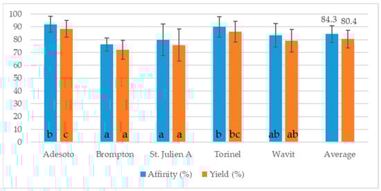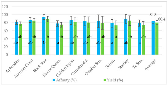 A comparison of the average affinity and yield of saplings, by variety used. Small letters indicate statistically different homogeneous subgroups.