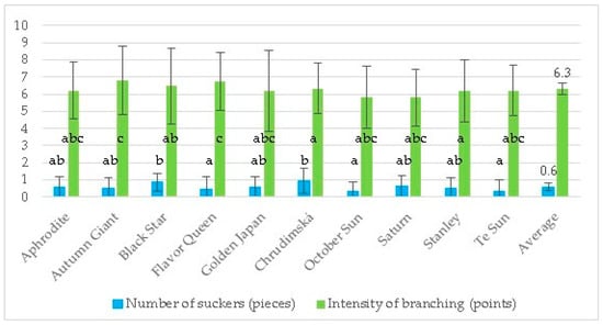 Average branching of the saplings (Table 3) was the strongest at the ‘Autumn Giant’ and ‘Flavor Queen’ varieties, both scoring 7 points (7–9 shoots/sapling). By contrast, the two European control varieties, ‘Stanley’ and ‘Chrudimská’, were the least branched with an average of 4 points (which corresponds to 3–4 shoots/sapling). Overall, the average branching score was 6 points, which corresponds to the production of 6–7 shoots/sapling (Figure 4). Statistical multiple factor analysis using Tukey’s HSD test found significant differences (p < 0.01) between varieties, which were classified into three homogeneous subgroups according to trunk branching. Statistical analysis did not prove significant interactions (p > 0.05) between varieties and years of evaluation.