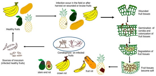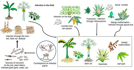 Plant-pathogenic Fusarium species have a range of infection strategies, of which most of the species are hemibiotrophs, as, during the early infection stage, the pathogen depends on the living host for growth and development. The pathogen turns into a necrotroph which eventually kills the plant host [10]. Root infection by Fusarium originates from inoculum in the soil, and infection on above-ground plant parts is from water (rain splash) and air. Some species can directly infect the plant host, and there are species that infect the plants through a wound. A wound on the plant and plant parts predisposes the plant to infection by Fusarium. Fusarium species cause plant diseases spread by soil, seed, and air and can adhere to residual plant mass; hence species of Fusarium infect a wide range of host plants. Infection on plants cause various diseases, including vascular wilt, root and stem rot, crown rot, damping off, and canker [7]. Harvested fruit crops can also be infected with Fusarium, which can cause fruit rot and stem end rot. The general disease cycle of Fusarium disease infection of major tropical fruit crops in the field is shown in Figure 1, and infection after harvest is shown in Figure 2.
