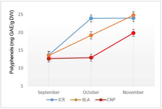 The ICR samples showed an accumulation of polyphenols between 13.69 ± 0.01 mg GAE/g DW and 24.01 ± 0.02 mg GAE/g DW, the value increasing with the maturation of the pseudo-fruits. For the BLA samples the values varied between 13.52 ± 0.01 mg GAE/g DW and 24.77 ± 0.02 mg GAE/g DW. For the CNP samples the values of polyphenols ranged between 12.67 ± 0.01 mg GAE/g DW and 19.83 ± 0.01 mg GAE/g DW registering an increased percentage of 58.2% in the last month of pseudo-fruits harvesting (Figure 1).