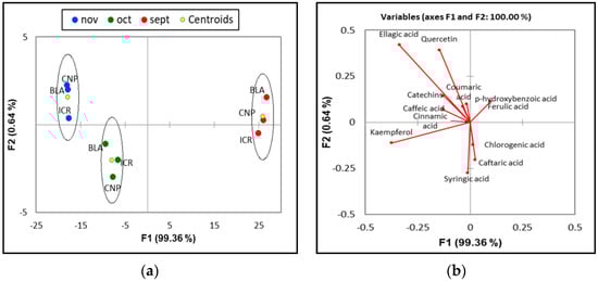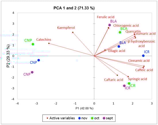 Principal component analysis (PCA) allowed the investigation of data variability and the differentiation of extract sources depending on the month of harvest, the geographical location and the compositional profile. PCA score plot showed that the first two principal components (PC1 and PC2) explained approximately 71% of the variance, with a clear grouping of samples (Figure 3). The BLA samples are located in the upper right quadrant, with a clear separation according to the harvest month. CNP samples are positioned on the left side of the score plot, while the ICR samples are positioned lower right quadrant. The loading plot presents the separation of the extracts based on their phenolic content. While ferulic acid was found in the highest concentration in BLA from September, quercetin, coumaric acid and p-hydroxybenzoic acid were detected at the highest values in BLA samples. The high content of cinnamic, caftaric, syringic and caffeic acids is specific to ICR samples, and CNP samples are distinguished by the content of kaempferol and catechins.
