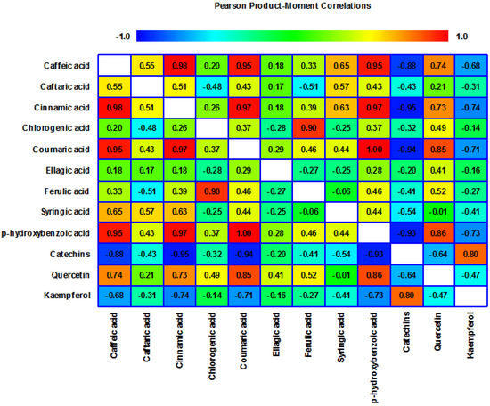 The results were confirmed by the Pearson correlation index performed for the extracts of J. communis pseudo-fruits. The heatmap of Pearson correlation coefficient (Figure 4) revealed a strong positive correlation between caffeic acid, cinnamic acid, coumaric acid and p-hydroxybenzoic acid and strong negative correlations with catechins and kaempferol.