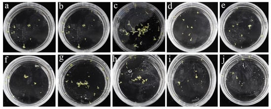 The microspore-derived embryo yield corresponded to incremental TDZ concentrations of two genotypes of curly kale: (a) The embryos of genotype ‘Starbor F2’ yielded without TDZ addition. (b–e) The embryos of genotype ‘Starbor F2’ yielded in the presence of TDZ. (f) The embryos of genotype ‘Winterbor F2’ yielded without TDZ addition. (g–j) The embryos of genotype ‘Winterbor F2’ yielded in the presence of TDZ. The TDZ concentrations for each row from left to right were 0, 0.1, 0.2, 0.3, and 0.4 mg/L.