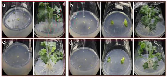 In the rooting stage, it was observed that the regenerated plants of two genotypes of curly kale were difficult to take root. To address this issue, we selected ‘Starbor F2’ seedlings, most of which failed to take root, as the test material for the rooting rate. Compared with the control (0.1 mg/L NAA + MS), by adding 0.2 and 0.3 mg/L NAA to MS medium, we found that there was no significant difference in the rooting rate among the treated seedlings (Table 3). By contrast, in 1/2 MS media, 0.1 to 0.2 mg/L NAA was beneficial to root development. As shown in Figure 4b, abundant roots were produced in 1/2 MS media and distributed evenly, among which the rooting rate reached 93.33% at the concentration of 0.2 mg/L NAA, which was significantly higher than that at other concentrations (Table 3, Figure 4a). These results demonstrated that the 1/2 MS medium had a superior rooting effect for curly kale.