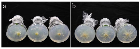 The effects of MS and 1/2 MS medium on the rooting of regenerated plants under the treatment of 0.2 mg/L NAA: (a) Normal regenerated seedlings were difficult to take root in 100% MS medium. (b) The 1/2 MS medium containing 0.2 mg/L NAA could effectively promote the rooting of normal seedlings.