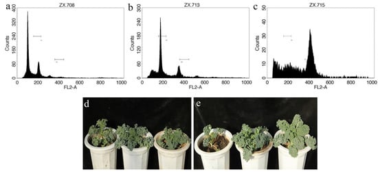 Ploidy identification by flow cytometry and the regenerated plants of haploid doubled haploids, and polyploids: (a) DNA content distribution of haploid plants. (b) DNA content distribution of doubled haploid plants. (c) DNA content distribution of polyploid plants. (d) Haploid, double haploid, and polyploid regenerated plants of ‘Starbor F2’ in sequence from left to right. (e) Haploid, double haploid, and polyploid regenerated plants of ‘Winterbor F2’ in sequence from left to right.