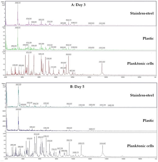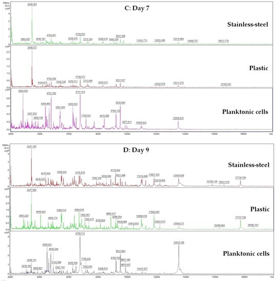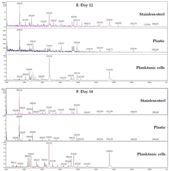 Changes in protein spectra during biofilm development in the presence of FEO were monitored using MALDI-TOF MS Biotyper. Biofilm samples were taken from plastic and stainless-steel surfaces by a sterile cotton swab and were directly transferred to a MALDI-TOF plate. A 300 µL of culture medium was taken for analysis of planktonic cell spectra. A suspension with planktonic cells was centrifuged for 1 min at 12,000 rpm. The pellet was washed three times in ultrapure water and resuspended. A total of 1 μL was applied to a target plate.