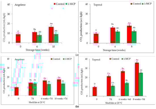CO2 production of plum after cold storage at 1 °C (a) and subsequent shelf-life storage at 20 °C (b). Presented values are mean ± SD. Upper case is for the comparisons of time (Tukey’s, p < 0.05). Lower case is for the comparisons of treatment (Tukey’s, p < 0.05).