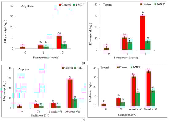 Ethylene production of plum during cold storage at 1 °C (a) and subsequent shelf-life storage at 20 °C (b). Presented values are mean ± SD. Upper case is for the comparisons of time (Tukey’s, p < 0.05). Lower case is for the comparisons of treatment (Tukey’s, p < 0.05).