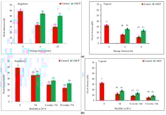 Flesh firmness of plum during cold storage at 1 °C (a) and subsequent shelf-life storage at 20 °C (b). Presented values are mean ± SD. Upper case is for the comparisons of time (Tukey’s, p < 0.05). Lower case is for the comparisons of treatment (Tukey’s, p < 0.05).