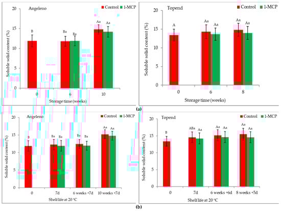 Soluble solid content of plum during cold storage at 1 °C (a) and subsequent shelf-life storage at 20 °C (b). Presented values are mean ± SD. Upper case is for the comparisons of time (Tukey’s, p < 0.05). Lower case is for the comparisons of treatment (Tukey’s, p < 0.05).