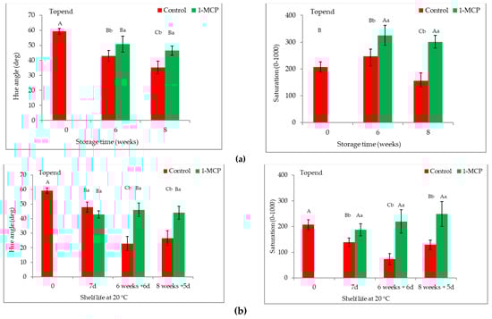 Hue angle (left) and saturation (right) of flesh of ‘Topend’ samples during cold storage at 1 °C (a) and subsequent shelf-life storage at 20 °C (b). Upper case is for the comparisons of time (Tukey’s, p < 0.05). Lower case is for the comparisons of treatment (Tukey’s, p < 0.05).