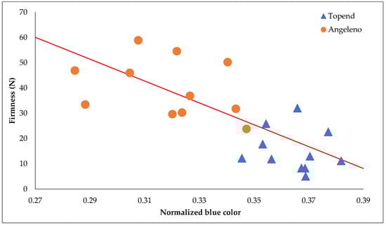 Relationship of normalized blue value and firmness for ‘Angeleno’ and ‘Topend’ cultivars.