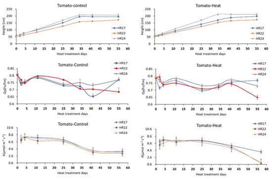 - Aldubai, A.A.; Alsadon, A.A.; Migdadi, H.H.; Alghamdi, S.S.; Al-Faifi, S.A.; Afzal, M. Response of Tomato (Solanum lycopersicum L.) Genotypes to Heat Stress Using Morphological and Expression Study. Plants 2022, 11, 615. [Google Scholar] [CrossRef] [PubMed]