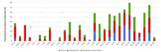 Plant growth-promoting abilities in selected bacterial strains as synthesis of auxins, siderophores, and phosphate solubilization are shown in Figure 1. Two strains isolated from strawberry rhizosphere (Pseudomonas kribbensis FC5.2 and Bacillus velezensis FC37) and five from blueberry (Mixta calida AC14, Enterobacter quasiroggenkampii AC15, Chryseobacterium cucumelis ACH2, Klebsiella variicola ACH10, and Enterobacter kobei ACH25) displayed the three tested properties. Klebsiella variicola ACH10 showed the best results. It is noticeable that strains from blueberry rhizosphere showed more plant growth-promoting activities and with higher values than those from strawberry rhizosphere.