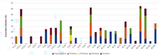 The biocontrol-related enzymatic activities (β-glucosidase, amylase, cellulase, chitinase, and casein) measured in the selected bacterial strains are shown in Figure 2. None of the isolated strains displayed all biocontrol activities or HCN production. The strain Bacillus albus FC32 was the only one that displayed chitinase activity. This strain, together with strains Xanthomonas translucens FC10.1, B. velezensis FC37, Microbacterium arborescens ACH15, and B. velezensis ACH16, showed four out of five biocontrol activities. Some strains from strawberry rhizospheres did not show any biocontrol activities.