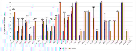 M. phaseolina growth inhibition was assessed on TOR-102 and TOR 872 isolates. Most strains were able to inhibit M. phaseolina growth at some level, but B. velezensis FC37, P. aeruginosa AC17, and B. velezensis ACH16 totally inhibited the growth of both fungi isolates (Figure 3). We found a significant effect of the bacterial strains on the inhibition of M. phaseolina (H (28) = 118.5, p < 0.001).