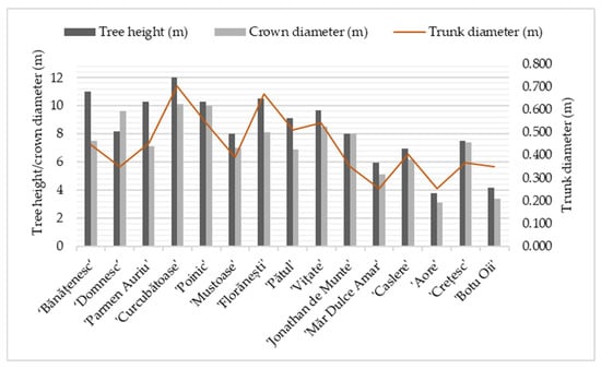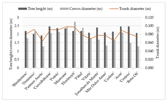 The values of the trunk diameter (Table 1) of the initial biological material varied between 254.77 mm in the ‘Aore’ and ‘Măr Dulce Amar’ varieties and 700.63 mm in the ‘Curcubătoase’ variety, with an experimental average of 438.63 mm. Eight of the varieties studied had values below the experimental average, while seven varieties were above the average value [27].