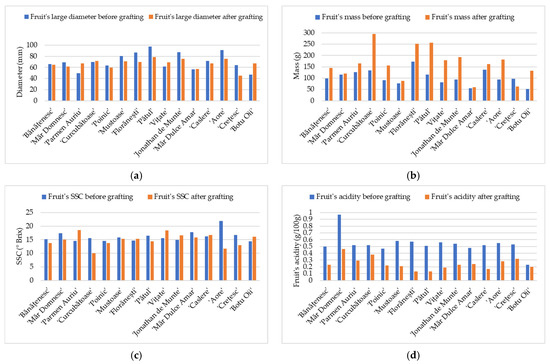 External and internal characteristics of fruits before and after grafting: (a) large fruit diameter; (b) fruit mass; (c) soluble solid content; (d) fruit acidity.