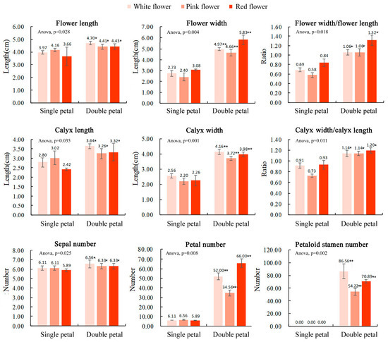 Morphological flower parameters of 6 ornamental pomegranate varieties. One asterisk and two asterisks indicated significant differences at p < 0.05 and p < 0.01, respectively, between the two types of flowers (single- and double-petals) according to the Duncan test. The standard deviation was also indicated.