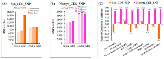 Statistics of synonymous and nonsynonymous SNPs in coding regions and their correlation analysis with morphological parameters. (A) Statistics of Syn_CDS_SNP number in six varieties; (B) Statistics of Nonsyn_CDS_SNP number in six varieties; (C) Correlation analysis between the number of Syn_CDS_SNP/Nonsyn_CDS_SNP and morphological indicators. Two asterisks indicated significant differences at p < 0.01, between the two types of flowers (single- and double-petals) according to the Duncan test.