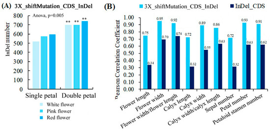 Quantitative statistics of 3X_shiftMutation_CDS_InDels and its correlation with phenotypic parameters. (A) Quantitative statistics of 3X_shiftMutation_CDS_InDels; (B) Correlation analysis between two types of InDels and morphological parameters. Two asterisks indicated significant differences at p < 0.01, between the two types of flowers (single- and double-petals) according to the Duncan test.