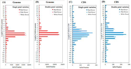 Length distribution statistics of insertion or deletion. (A) Length distribution map of insertion or deletion in genome region of single-petal varieties; (B) Length distribution map of insertion or deletion in genome region of double-petal varieties; (C) Length distribution map of insertion or deletion in CDS region of single-petal varieties; (D) Length distribution map of insertion or deletion in CDS region of double-petal varieties.