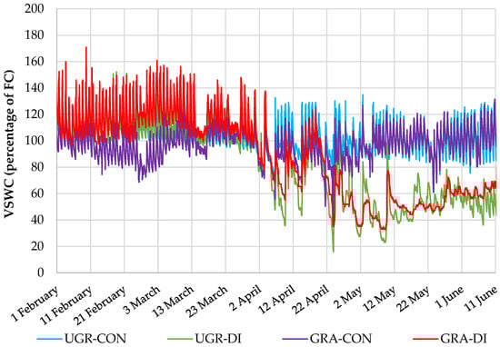 Volumetric soil water content (VSWC) expressed as a percentage of field capacity (FC) for the substrate corresponding to the grafting factor, grafted (GRA) and ungrafted (UGR), and for both water stress levels: control (CON) and deficit irrigation (DI).