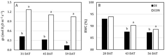 Stomatal conductance (gs) (A) and relative water content (RWC) (B) for both water stress levels: control (CON) and deficit irrigation (DI). Measurements were taken on 31, 45, and 59 DAT for gs and 28, 43 and 56 DAT for RWC. Different letters indicate significant differences at p ≤ 0.05 (Fisher’s LSD test). Data are the mean of grafted and ungrafted plants (four replicates each).