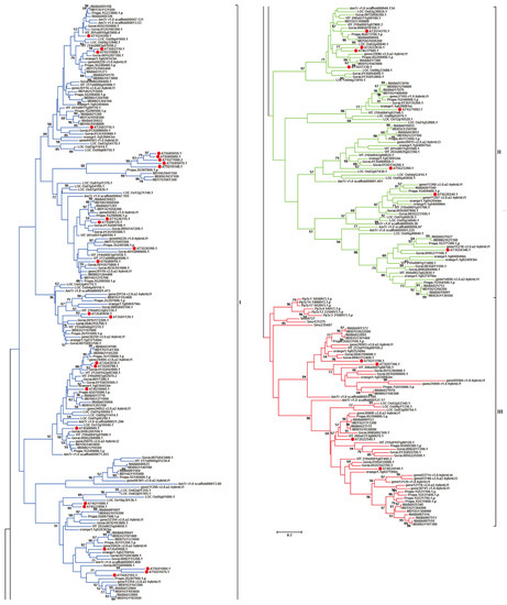 - Goodstein, D.M.; Shu, S.; Howson, R.; Neupane, R.; Hayes, R.D.; Fazo, J.; Mitros, T.; Dirks, W.; Hellsten, U.; Putnam, N.; et al. Phytozome: A comparative platform for green plant Genom. Nucleic Acids Res. 2012, D1, D1178–D1186. [Google Scholar] [CrossRef]
