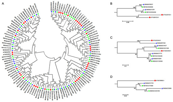 Phylogenetic analysis of MIKCC-type MADS-box genes among A. thaliana and Malus species. (A) Phylogenetic tree. (B) A-class MIKCC-type MADS-box genes. (C) B-class MIKCC-type MADS-box. (D) C-class MIKCC-type MADS-box genes. Solid red circles, blue triangle, and green rhombus represent MIKCC-type MADS-box genes in A. thaliana, M. baccata, and M. domestica, respectively.