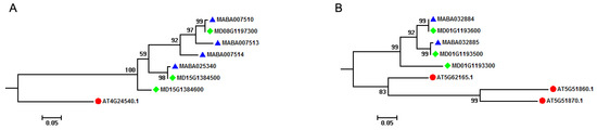 Orthologous relationship of MIKCC-type MADS-box genes among A. thaliana and Malus species. (A) Phylogenetic tree subgroup of AT4G24540 MIKCC-type MADS-box gene indicating the effect of tandem duplication event on the generation of MIKCC-type MADS-box genes in Malus species. (B) Phylogenetic tree subgroup of AT5G62165, AT5G51860, and AT5G51879 MIKCC-type MADS-box genes indicating the effect of tandem duplication event on the generation of MIKCC-type MADS-box genes in A. thaliana and Malus species. These phylogenetic tree subgroups are from the phylogenetic analysis of MIKCC-type MADS-box genes among A. thaliana and Malus species in Figure 3. Solid red circles, blue triangle, and green rhombus represent MIKCC-type MADS-box genes in A. thaliana, M. baccata, and M. domestica, respectively.