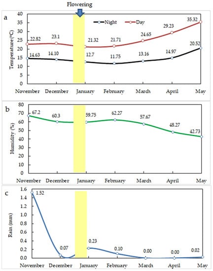 Changes in average day and night temperature (a), humidity (b), and rainfall (c) from November 2020 through May 2021.