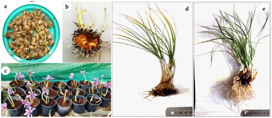 The root length, the number of roots, and the root fresh weight were determined 1 week after corm planting in different growing media (Figure 2b). Flowering parameters (i.e., the number of flowers per plant and stigma fresh and dry weight) were recorded 4 weeks after corm transplanting, and the flowering period lasted 8 days (Figure 2c). The stigma dry weight was determined after drying the stigmas for 1 h at 40 °C [,]. Vegetative growth parameters (i.e., leaf length, the number of leaves, plant fresh and dry weight, and root fresh and dry weight) were measured after 9 weeks of corm sprouting (Figure 2d,e). The dry weights of plants and roots were determined after oven drying for 48 h at 65 °C. After leaf senescence, the plants were lifted, the mother corm parts were removed, and the replacement corms were separated. Corm formation parameters (i.e., the number of corms per plant, corm diameter, and corm fresh weight) were recorded 18 weeks after corm planting.