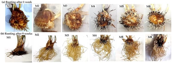 The type of growing media significantly influenced the number, length, and fresh and dry weight of roots after 1 and 9 weeks of planting (Figure 3). The M3 (sandy soil), M4 (peatmoss), and M5 (peatmoss + sandy soil) media provided favorable root initiation after 1 week (Figure 3). After 9 weeks, the M3 medium contained plants with the highest number of roots (≥140), followed by the M4 medium, whereas the M1 medium (loamy soil) contained plants with the fewest roots. The longest roots (21 cm) were recorded in the M4 medium, followed by the M5 medium, whereas the shortest roots (4 cm) were recorded in the M1 medium. Interestingly, after 9 weeks, the fresh weight of roots per corm increased gradually from the M1 medium to the M6 medium, with the highest value recorded in the M6 medium, followed by the M5 medium (peatmoss + foam; peatmoss + sand). Similarly, the root dry weight recorded the highest values in those two peatmoss mixtures (Figure 3c). Nine weeks after planting, a well-developed root system was observed in all growing media, except for M1, which had a low level of rooting (Figure 4).