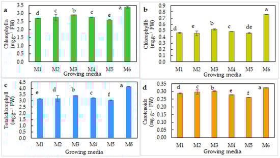 Content of saffron leaf pigments (a) chlorophyll a, (b) chlorophyll b, (c) total chlorophyll, and (d) carotenoids 9 weeks after planting in different growing media. M1: loamy soil; M2: silty soil; M3: sandy soil; M4: peatmoss; M5: peatmoss + sand; M6: peatmoss + foam. Different letters within a set of values denote significant differences at p ≤ 0.05, according to Tukey’s test.