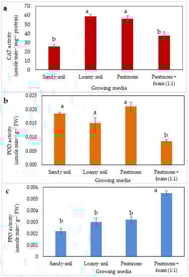 The type of growing media significantly influenced the antioxidant enzyme activity of saffron plants (Figure 6). The highest CAT activity was detected in plants grown in loamy soil, whereas the lowest CAT activity was detected in plants grown in sandy soil (Figure 6a). Saffron plants grown in peatmoss + foam exhibited lower POD activity but higher PPO activity than saffron grown in any other growing media (Figure 6b,c).