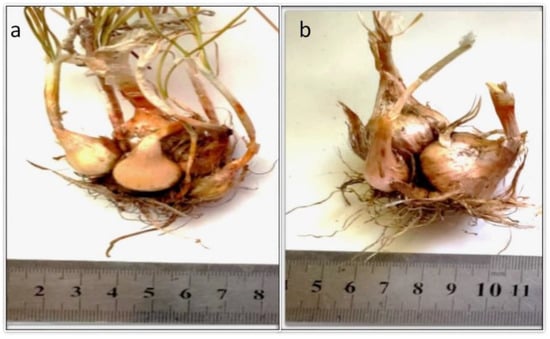 Saffron daughter corm formation after 18 weeks of culture in (a) sandy soil (M3) and (b) peatmoss + foam (M6).