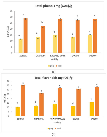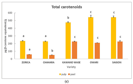 In Figure 2, the results of the bioactive compounds in the dry pulp residue and dry peel of the investigated Satsuma mandarins are presented. The total phenolic compounds of the mandarin dry pulp residue ranged from 11.56 mg GAE/g (‘Zorica’) to 15.09 mg GAE/g (‘Saigon’). The results are lower when compared to a prior report [28], where the total phenolic contents varied widely among mandarin genotypes, ranging from 15.98 to 22.26 mg/g dry weight (DW) (reported as gallic acid equivalents). The mandarin dry peel ranged from 22.24 mg GAE/g (‘Chahara’) to 28.77 mg GAE/g (‘Zorica’). Zhang et al. [29] reported the total phenolic content in different citrus genotypes of Citrus reticulata Blanco in a range from 22.80 to 32.76 mg GAE/g DW for freeze-dried mandarin peels, which is comparable to our results. Higher results (from 29.38 to 51.14 mg/g DW) of the total phenolic content in mandarin peel were reported by [30].